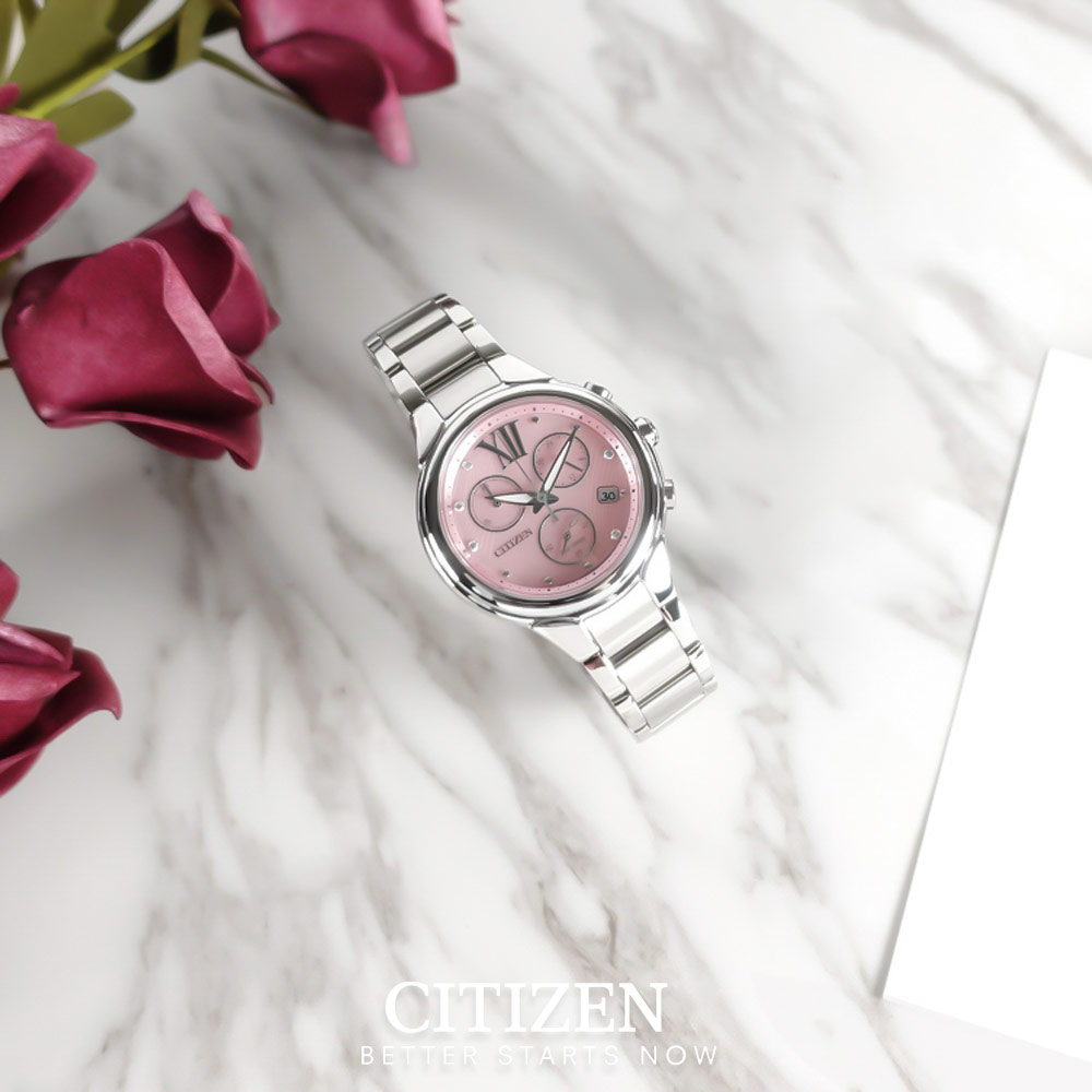 Phía nền mặt bên trong của đồng hồ nữ Citizen FB1310-52W được tạo hình theo tone màu hồng Pastel đậm chất nữ tính và đầy ngọt ngào. Citizen hiếm có thiết kế nào phủ gam màu này tương tự.